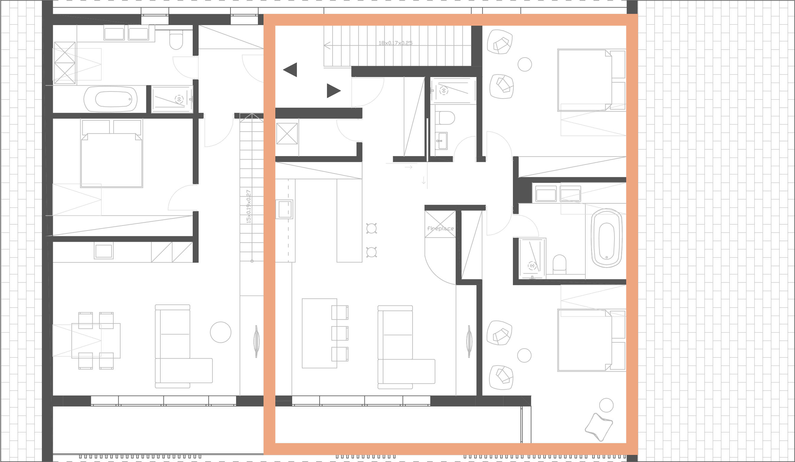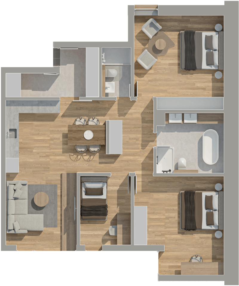 Velkorysý apartmán dispozičně řešený jako 4kk s podlahovou plochou 97,8 m² nabízí tři samostatné ložnice a dvě koupelny, z toho jednu en-suite u hlavní ložnice. Společenská část bytu tvořená obývacím pokojem, kuchyní a jídelnou je díky jižní orientaci a velkoformátovým oknům plná denního světla a navazuje na terasu o rozloze 10 m², která zaručuje soukromé posezení a krásné výhledy do horské přírody. Interiér bytu poskytuje dostatek vestavěných úložných prostor a ke každému apartmánu náleží také rezervované prostory na uložení lyží či kol, přístup do společného wellness s finskou saunou a na rozlehlou zahradu resortu s odpočinkovými zónami.