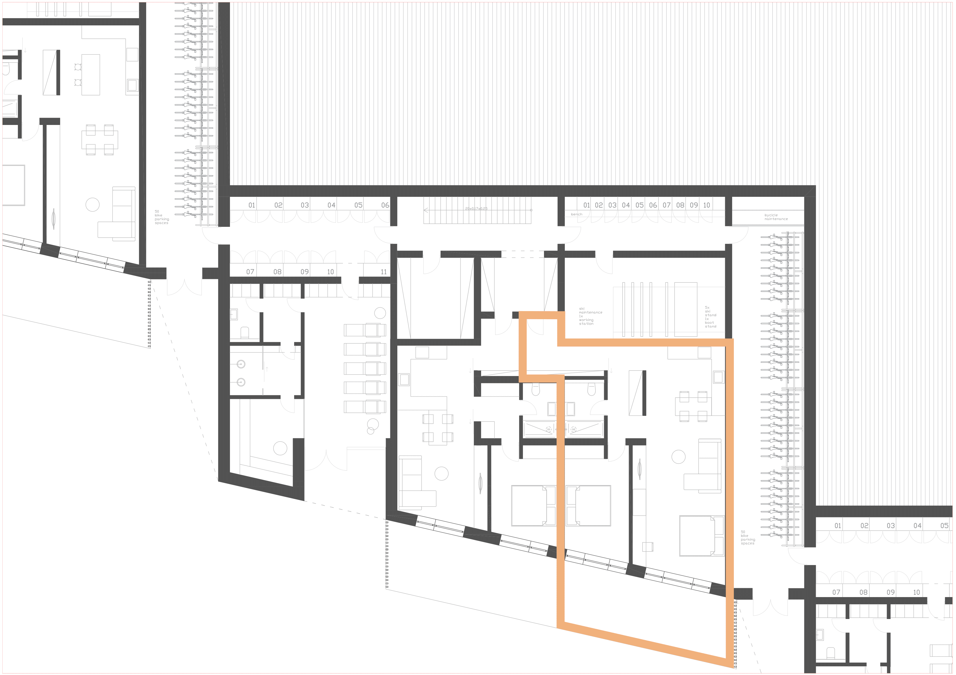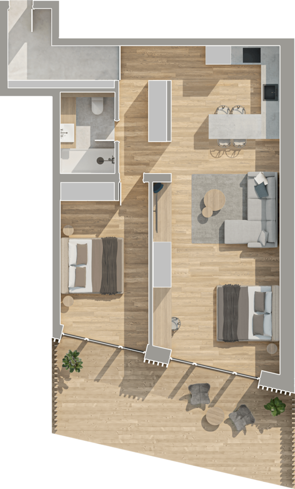 Jednoložnicový apartmán s podlahovou plochou 76,9 m2 nabízí jižní orientaci společenské místnosti i ložnice, a i díky modernímu prosklení fasády tak poskytuje velkorysé denní osvětlení. Interiér bytu poskytuje dostatek vestavěných úložných prostor a ke každému apartmánu náleží také rezervované prostory na uložení lyží či kol, přístup do společného wellness s finskou saunou a na rozlehlou zahradu resortu s odpočinovými zónami.