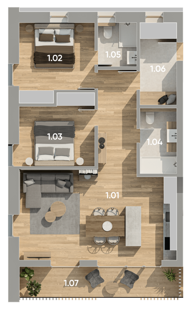 | 1.02 | Hlavní ložnice | 11,9 m² |